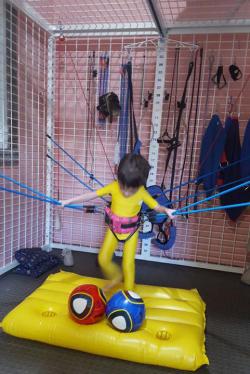 LUCCA - 4 ANOS: Brinca de chutar bola na Spider. Ele usa a sleeve proprio e a legging proprio aumentando sua capacidade de concentração e deixando a terapia mais agradável.